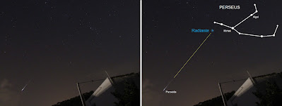 Esto contesta la pregunta anterior de porqué distinguimos unas estrellas fugaces de otras. Para acabar voy a poner una imagen reveladora... aquella con la que comenzaba la entrada. Una supuesta perseida y la constelación de Perseo. En la mitad de la derecha pongo la silueta de la constelación así como el punto del supuesto radiante (mírese la foto anterior generada por Stellarium, el radiante efectivamente está ahí). Si prolongo la dirección de la estrella fugaz su trayectoria pasa por el radiante de las perseidas. No cabe duda de que es una de ellas. No hay más preguntas, señoría.