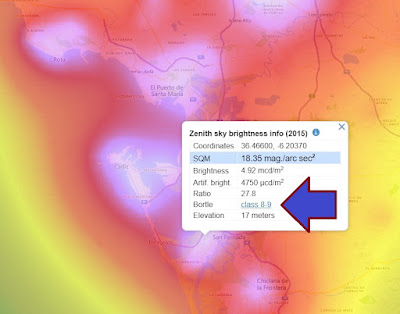 Lo primero en lo que me fijo es en su magnitud (en este caso para esa noche). Ya sea 4'02 o 4'41, escala Bortle 8, podría verse en cielos con escala Bortle 7, 6, 5, 4... eso no está mal, por ejemplo, si miramos el mapa de contaminación lumínica de Cádiz, debería verse sin problemas en la región señalada (y en muchas más).